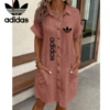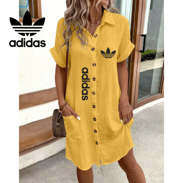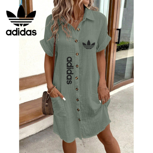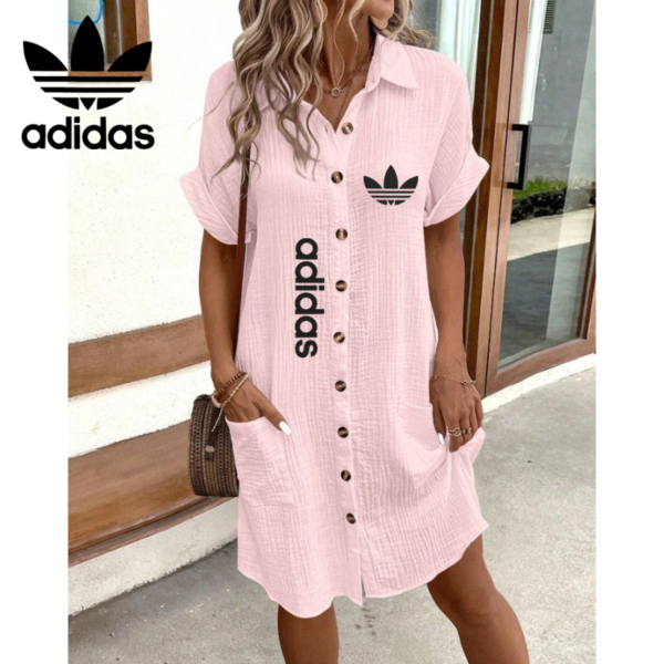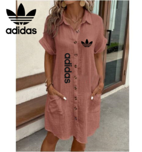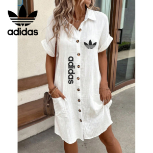 Step into casual chic with this Adidas – New Summer Dress that blends comfort with iconic branding. Designed in a relaxed fit with rolled sleeves and a button-down front, this dress is the perfect companion for days when you want to look put-together without trying too hard.
